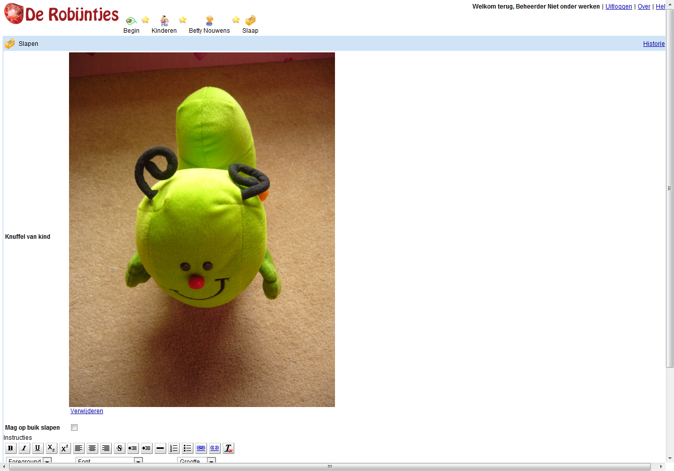 Onder "Slaap instructies" kunt u als medewerker, maar ook als ouder, instructies voor het slapen opslaan. Ook kan er een plaatje van een knuffel van het kind toegevoegd worden. Dit kan vooral handig zijn als u te maken heeft met veel kinderen en u niet zeker weet welke knuffel bij het betreffende kind hoort.