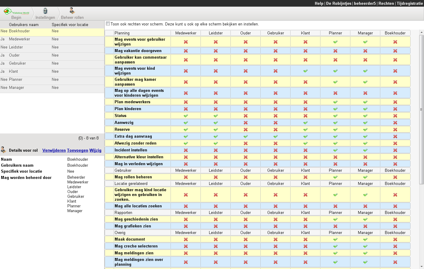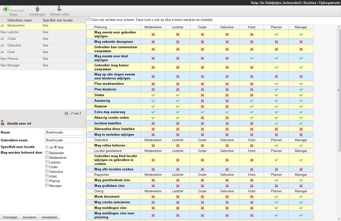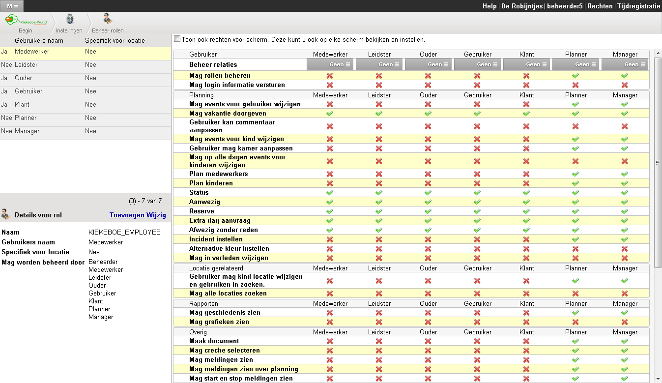 In dit scherm kunt u de rechten van groep gebruikers aanpassen. Dit bied de mogelijkheid tot het inrichten van Kiekeboe World naar uw eigen wensen. Personen hebben rollen. Rollen kunnen locatie specifiek zijn. Indien een rol locatie specifiek is wordt deze hebeerd onder de details van de